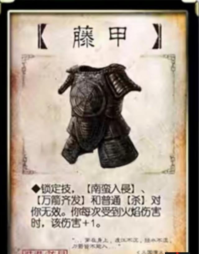 如果场上有卧龙这样的武将存在,而你还去装上这个装备。那我只能说傻的可爱,或者说你手上有铁索连环可以将卧龙连起来,那样也是可以装起来的。装备有藤甲,仁王盾,八卦阵这三种防具,而藤甲又是其中唯一一个能防住万箭齐发、南蛮入侵这样的aoe。虽然说他在游戏有被人戏称“疼甲”,但是凭借他的优点,完全是可以一点负面影响。你要想一想,在这个aoe满天飞的时代,你没有一两个装备在身,你如何苟到最后。藤甲疼甲,装在身上很疼。这一句话是没有错,一般玩家都是将火杀屯起来,静待对手安上疼甲。牌堆一种只有三张火攻,五张火杀。现在很多模式都有记牌器这个玩意了,只要在你快要撑不下去的时候可以装上藤甲,或者说你试过,三张火攻,五张火杀全都出过了,而此时牌堆还没有用完,那么这个时候你就可以将这藤甲装上了。疼甲有一个致命的克制武器,那就是朱雀扇子了。这武器可以将任何一张普通杀转换成火杀来攻击。如果说你明知场上有朱雀扇子的存在,还要装这个疼甲的话,那对手心里爽歪歪队友心里就很苦涩了。