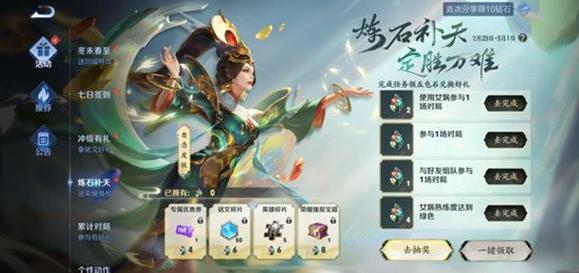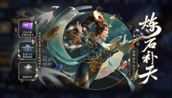 炼石补天活动正在进行中,活动一直持续到3月1日,在此期间大家都可以参与活动进行对局,完成活动的相关任务之后玩家就可以得到五色石道具,五色石的作用就是解锁对应的奖励,还能兑换女娲补天皮肤的150专属点券卡,购买女娲新皮肤的时候可以使用这个点券卡,抵扣之后只用1280点券就能得到女娲补天皮肤。