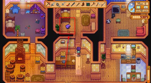 2、短裤的位置就在那个卖动物的NPC的家里,也就是marnie的家里。我们家往下走在卧室里面看到一条紫色短裤,如下图。
