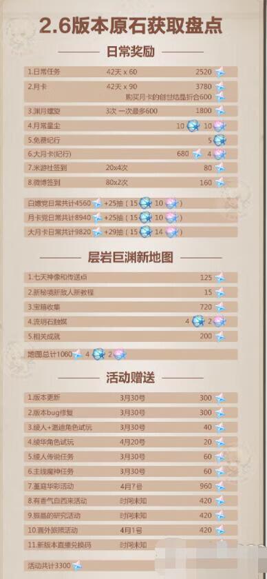 根据现有信息进行了原石获取数量统计,并且有着详细的分类依据,默认2.6版本为通常的42天计算。