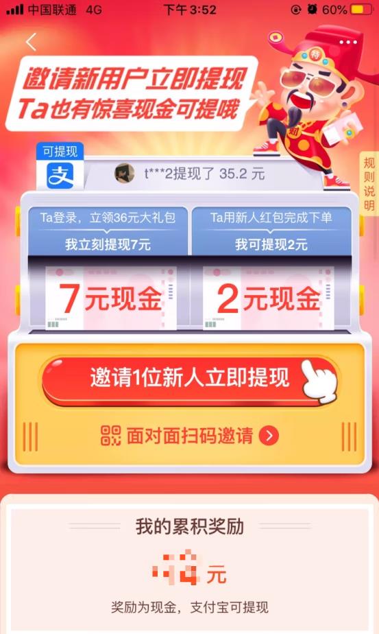 2、进入活动后,点击“邀请1位新人立即提现”按钮