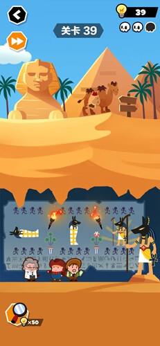 这一关用刀割开骆驼背包,得到火柴,点燃下面的蜡烛,将下方的所有小人按照总队列的朝向顺序变换朝向,然后就可以获得一个宝石了,把宝石安在阿努比斯腰上,就能触发机关了。