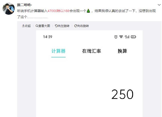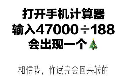 《微博》上最近有个圣诞节的梗,是关于手机计算器的,其实也算是流行了好几年的梗,居然还有人上当,技术那个来自手机计算器的祝福,47000除以188会出现圣诞树,祝你圣诞快乐的表情包!其实没用,就会出现250!