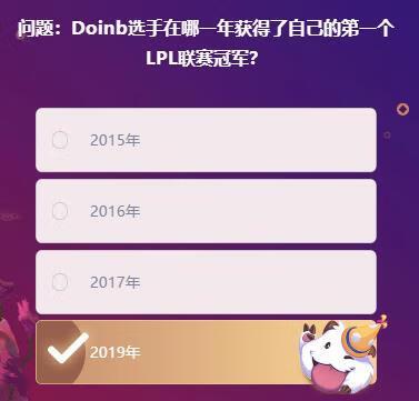 英雄联盟手游中,游戏中2月18日的每日明星挑战赛中,其中的一个问题是:“Doinb选手在哪一年获得了自己的第一个LPL联赛冠军?”,很多玩家不知道是哪一年。下面小小编小编为大家带来正确的答案分享,还不知道的小伙伴快随小小编小编一起来看看吧!