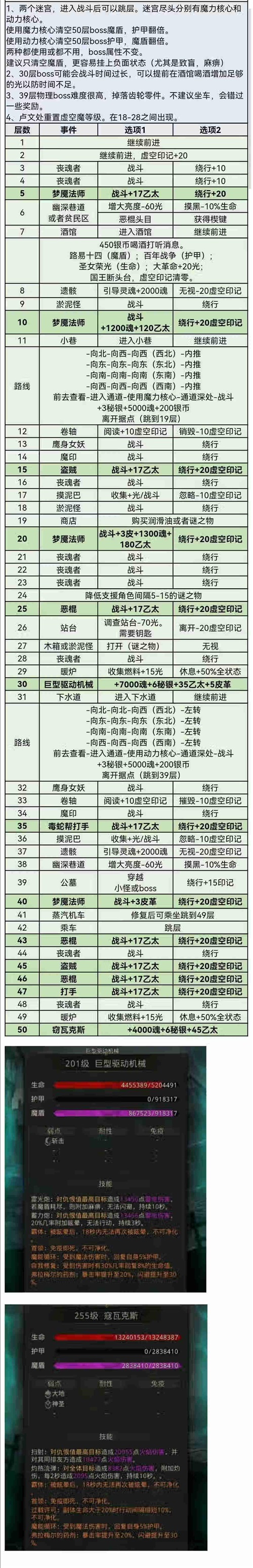 3、30层boss可能会战斗时间过长,可以提前在酒馆喝酒增加足够的光以防时间不足。39层物理boss难度很高,掉落齿轮零件。不建议坐车,会错过一些奖励。