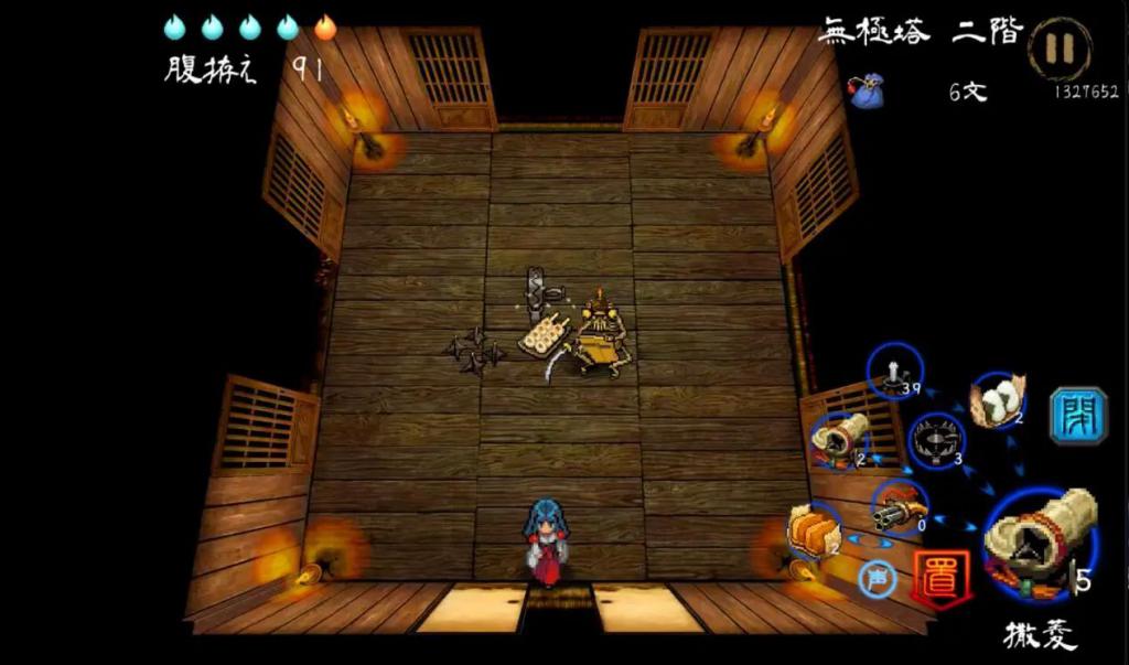 根据这些环境变化,玩家可以在实际遇敌之前便设下陷阱。和大部分同类游戏不同的是,《深 四目朝生 - 阴阳之巫女 -》虽然同样以 " 房间 " 为单位分割地图,但房间与房间之间却不存在程序上的独立关系。玩家可以通过移动房间逃避敌人的追击,但敌人同样也会越过房间穷追不舍,这就给了玩家更多与 " 房间 " 互动的空间,可以利用各种各样的道具,创造对自己有利的条件。