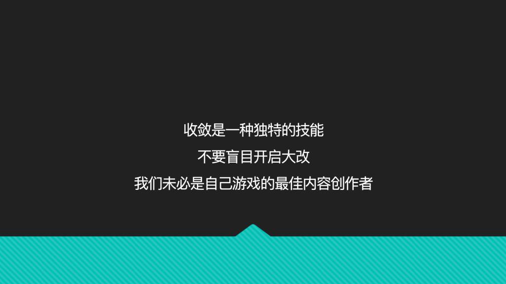 如果游戏的切片或原型遇到瓶颈时,大家的第一反应通常是:首先认为内容太少,还没做完,需要更多时间。其次,认为打磨不够,细节尚未调整好,有 bug,但修复后就可以改善。第三种更极端的观点是,确实存在问题,但认为问题在底层逻辑,需要大幅修改内容。