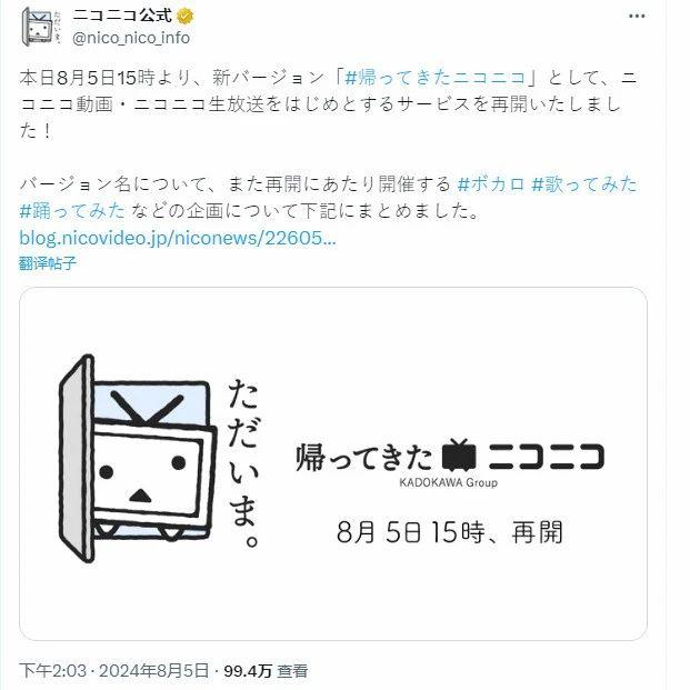 今日,日本弹幕 NicoNico 宣布正式恢复,包括动画、歌曲、直播等分区功能也均已上线。不过,自 2008 年起上线的 NicoNico 社区宣布关停,无法重新开放。