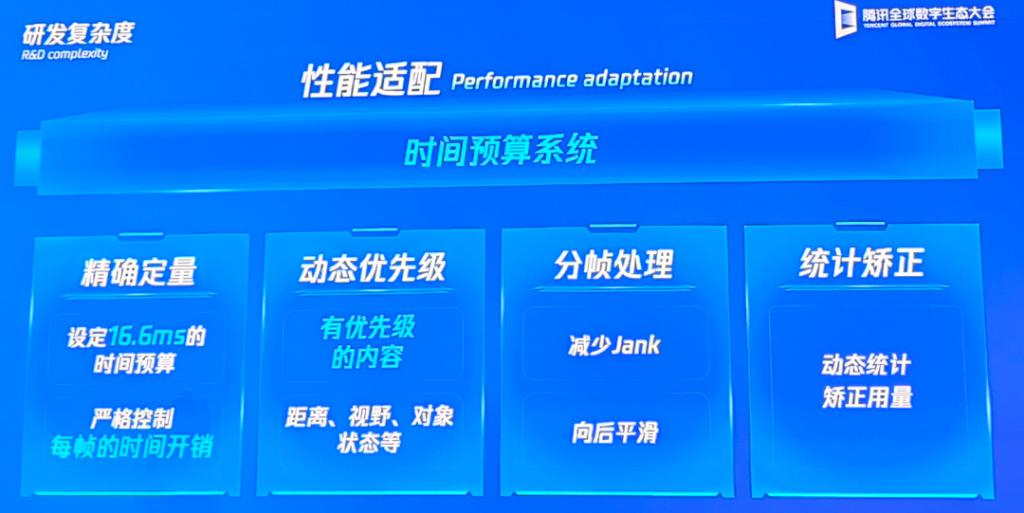 比如时间预算管理系统,我们《鸣潮》的性能需求划到 60 帧,一帧可用的时间是固定的 16.6ms,我们会严格遵照这个时间开销,优先展现对玩家体验影响最大的内容,一些算不完的内容往后顺延,保证每 16.6ms 都能刷新,给玩家平滑顺畅的游戏体验。