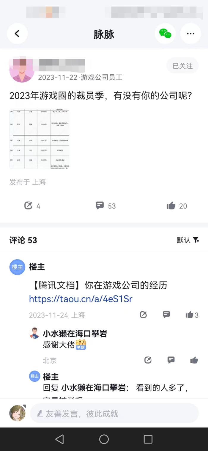 李青有点无奈,她继续逛社区。当时,一家大厂对传媒业务和游戏业务裁员的消息正传得沸沸扬扬,在一条有 50 多个讨论的帖子下,李青再次见到了类似的链接,内容却依旧是 " 被举报 " 的。她不甘心,终于在一条 " 楼中楼 " 评论里找到了还能用的链接,点击查看,发现是一份关于 2023 一整年来各个游戏公司裁员情况的调查。