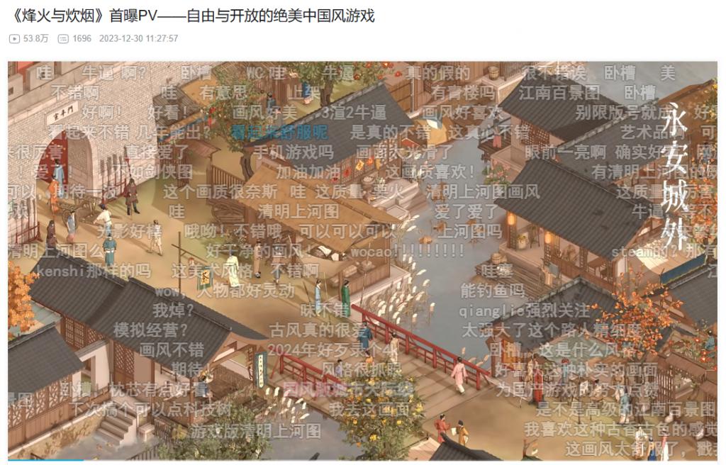 大家起初还只是以为这是款国风题材的模拟经营游戏,但随着潜行暗杀、即时战斗、探索解密等玩法的露出,弹幕纷纷打出了 " 啊?"。而当视频最后出现外交内政、开疆拓土等玩法时,大家已经开始有些害怕了——这么大的饼?真的能做出来吗?