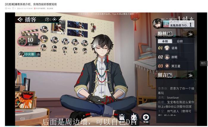 在 " 潮 " 这一思路下,项目组还做了更为细节的衍生设计。在角色养成界面,玩家可以进入到 " 播客 " 系统,这是一种类似于 " 直播间打榜 " 的休闲玩法,玩家可以给角色赠送礼物,提高角色在直播间的人气以及对玩家的好感度。好感度越高,玩家能解锁的角色档案资料就越多;播客界面右上角有人气值排名,以显示玩家们对各个角色的 " 厨力 "。此外,玩家还有机会在游戏中收集到 " 周边 "," 周边 " 可以用来装饰角色的播客背景。