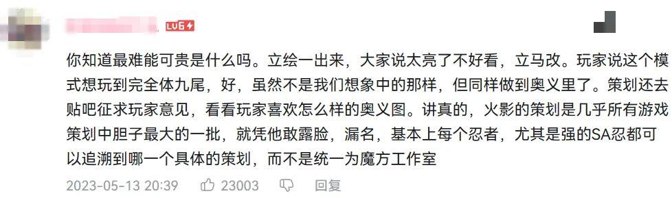 让玩家觉得 " 难能可贵 " 的一点是,《火影忍者》手游策划并不是自顾自地做设计,而是会通过策划说、贴吧等途径,和玩家沟通意见。玩家提的那些想法,只要不会对游戏平衡性造成太大影响,基本最终会被落实进游戏里。