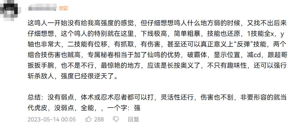 比如 5 月推出的九喇嘛鸣人,相比于其他角色,不仅是卷美术特效、动画表演,其强度和操作性也有讲究,普攻平 A 伤害可观,秀操作的空间也较大。