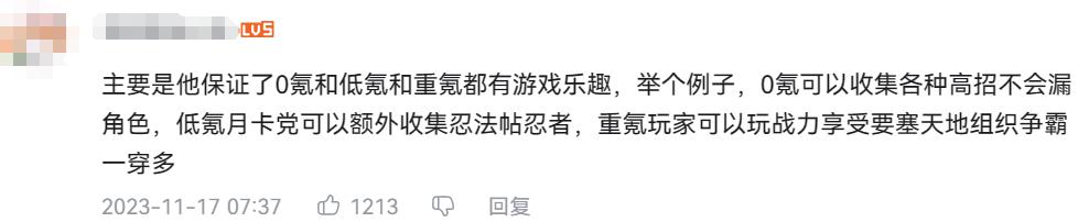 这与我先前在网上刷到的《火影忍者》手游玩家评论,基本一致,总结起来就是:内容品质有保障,且 0 氪、微氪、重氪都能享受格斗竞技乐趣。