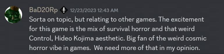 让我最为兴奋的是,这款游戏生存恐怖以及怪诞的部分,很有《Control》和小岛秀夫美学的影子。我真的超喜欢游戏里恐怖的氛围。我觉得,我们需要更多类似的作品。