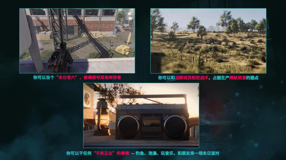 也因此,《七日世界》靠怪诞题材,带来了体验的自由度——你既能体验现实生存的部分(偷袭、抢资源、钓鱼、派对),也能去探索被扭曲、未可知的规则。