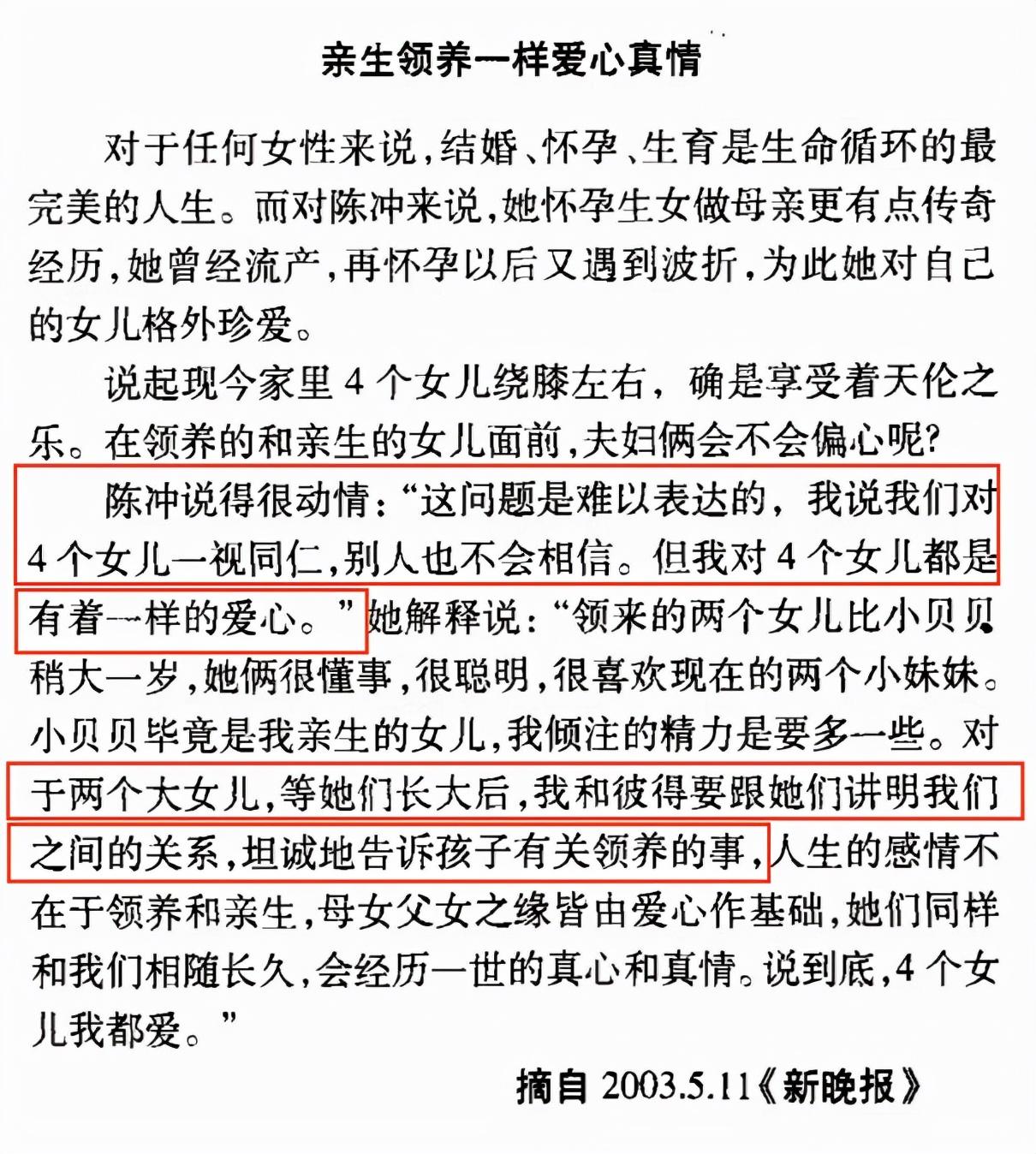 1998年10月,陈冲生下了大女儿,四年后,陈冲又生下了小女儿。2003年,某报刊上还刊登了陈冲受访时,谈起4个女儿的态度。