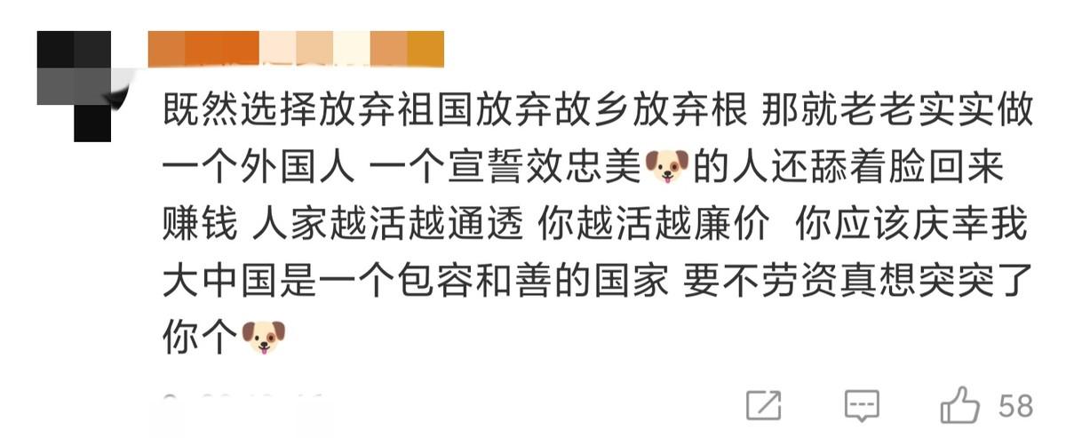 在这条动态的下方,也有一些网友留言,言辞激烈地表态称,既然已经宣誓效忠他国,就别再回来捞钱。