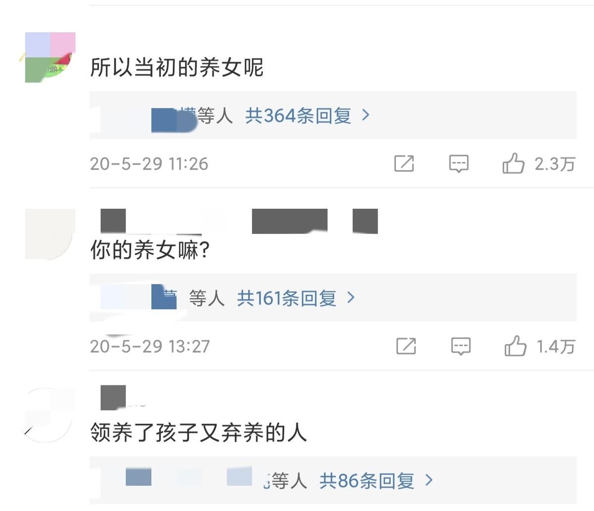 在近2万条回复中,有祝福恭喜的声音,但更多的是重提转让养女旧事的留言,即使已经过了10年,她的当时的所作所为也依然让很多人气愤不已。