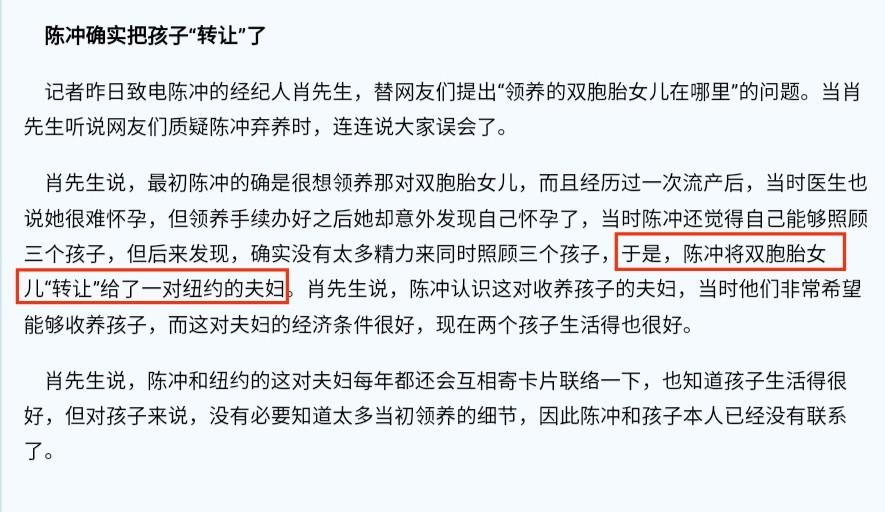由此,大众开始关心那对养女的现状,在媒体的追问下,陈冲的经纪人表示,由于她没有精力照顾这么多孩子,所以已经把双胞胎养女转让给了别人。