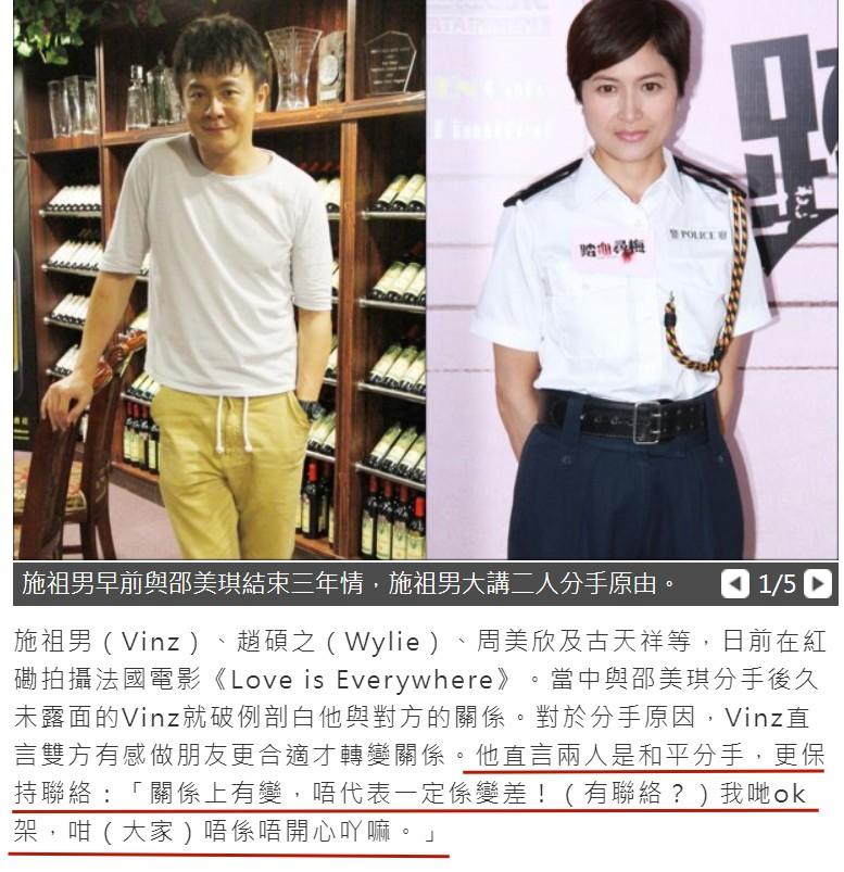 2015年,媒体大肆报道邵美琪再遭情变,施祖男疑似出轨嫩模导致双方分手。随后双方共用一个文案澄清:分手纯属个人原因,无关金钱,没有第三者。
