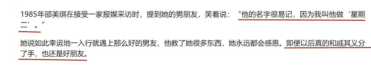 1991年,邵美琪和戚其义均以“工作繁忙”为由给这段师生恋画上了句号,不久之后戚其义便跳槽到了亚视,两人再见还是朋友。