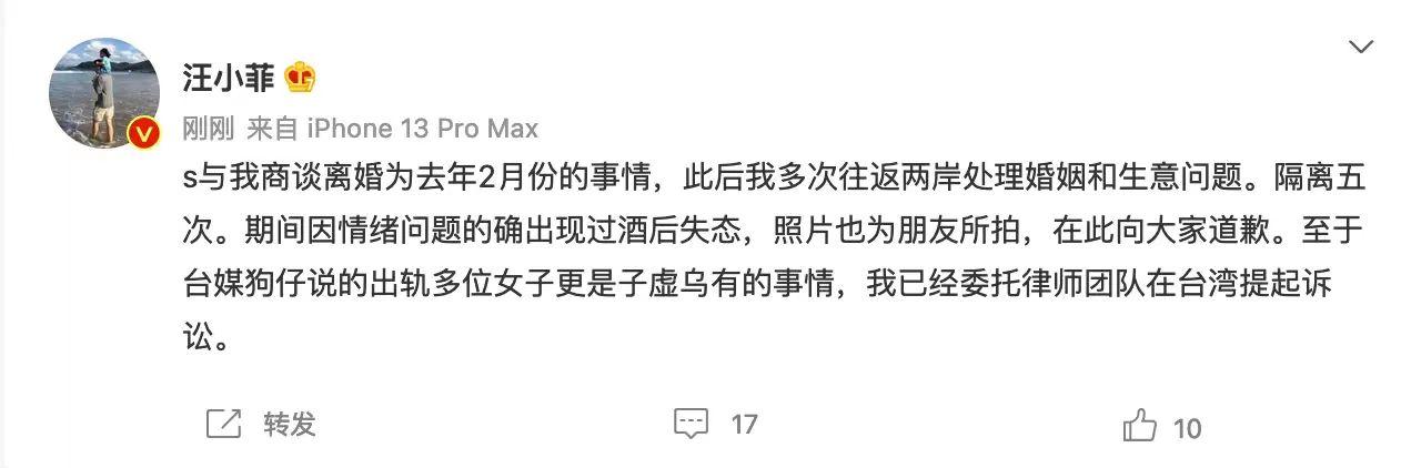 “S与我商谈离婚为去年2月份的事情,此后我多次往返两岸处理离婚和生意问题,隔离五次。期间因情绪问题的确出现过酒后失态,照片也为朋友所拍,在此向大家道歉,至于台媒狗仔说的出轨多位女子更是子虚乌有的事情,我已经委托律师团队在台湾提起诉讼。”