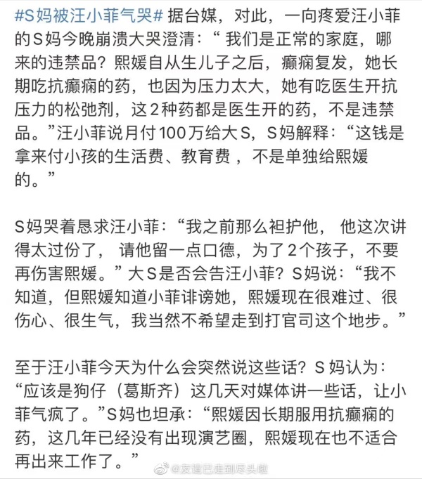 大S方也解释说明了自己吃的药是治疗癫痫的药物,而且100万台币是给两个孩子的生活费。
