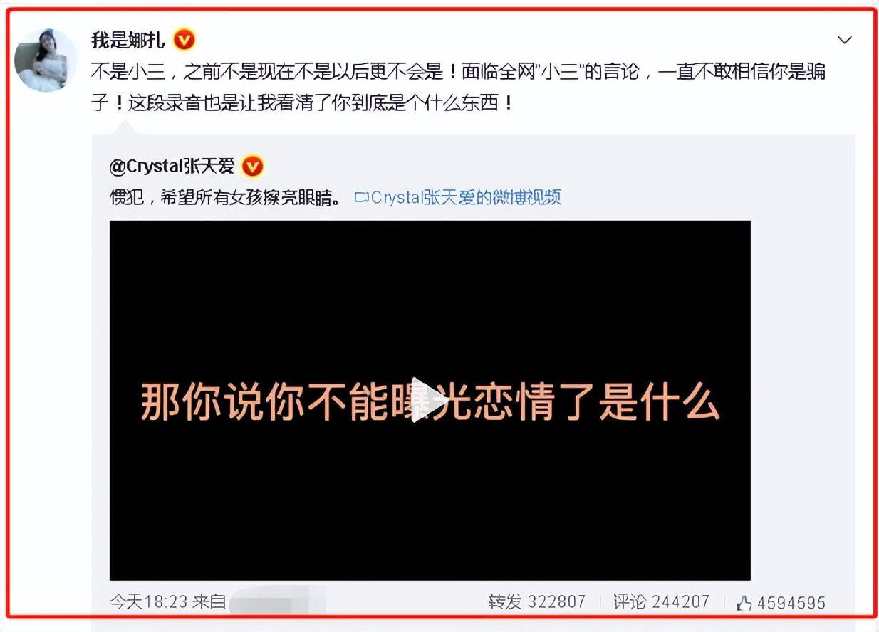 与此同时,娜扎也转发了张天爱的录音,公开表示“不是小三,之前不是现在不是以后更不会是!面临全网“小三”的言论,一直不敢相信你是骗子!这段录音也是让我看清了你到底是个什么东西”,貌似也是被徐开骋忽悠了。