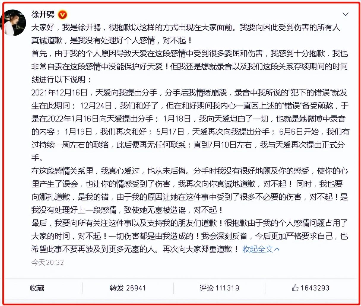 虽然徐开骋在文中和张天爱、娜扎都道了歉,但他做过的事却全部存在,预估事业之路就此停歇了。