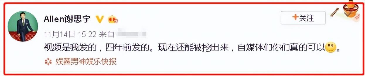 新闻发酵后,谢思宇主动出来认领视频,但却表示“视频是我发的,但是是4年前发的,你们都能挖出来,自媒体们真的可以”,简直将“甩锅”二字演绎到了极致。