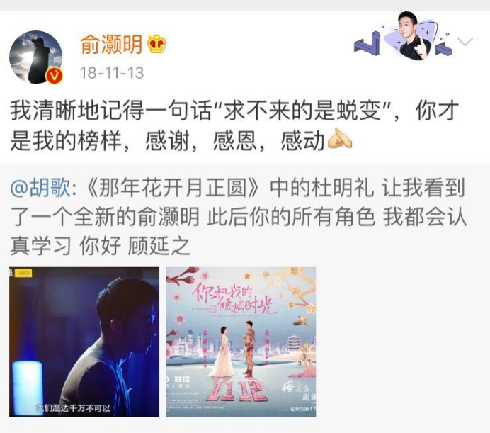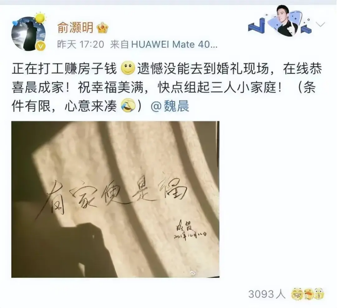 对于来时的路,过去的人,他也不曾忘记,年少参加比赛时,他与魏晨、王栎鑫等结成好兄弟,当年他们结婚时,俞灏明不忘送上真挚的祝福。
