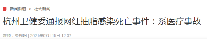 近日,某网红抽脂感染去世事件引起极大的社会关注。杭州市卫健委15日发布的初步调查情况通报显示,这是一起医疗事故,美容医院存在术前缺乏认识、术中操作不当、术后观察处理不及时等过错,与患者死亡存在因果关系,承担全部责任,并已作出赔偿。