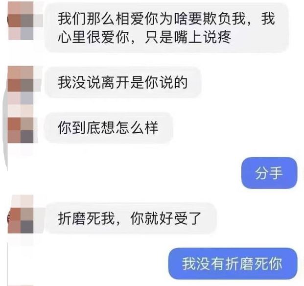这件事情有好几个版本,找最可信的一个版本说说吧,这件事的起因是一张微信的聊天截图,那个女的问自已的丈夫,我们那么相爱为啥要欺负我,我心里很爱你,只是嘴上说疼,男的意思就是分手,分手的原因就是知道了对方出轨的证据,而这女的还想和好,所以才有了这段聊天记录。