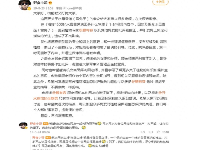 野食小哥的第二篇道歉博文,为这场短暂的争吵画上了休止符。