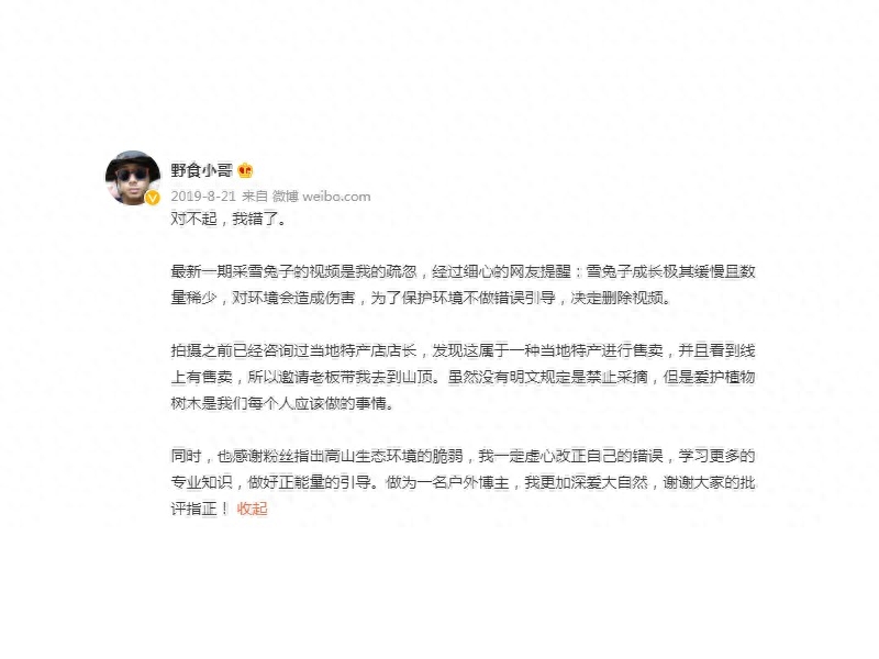 了解到这些后,野食小哥迅速删除了相关视频,并且发文道歉,称自己原先并不知道雪兔子是濒危植物。
