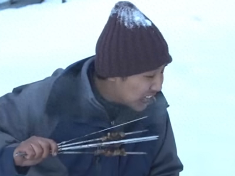 别人是上山找食材做美食吃,他给人的感觉是带着食材上山去吃,牙口倍儿好,吃嘛嘛香。