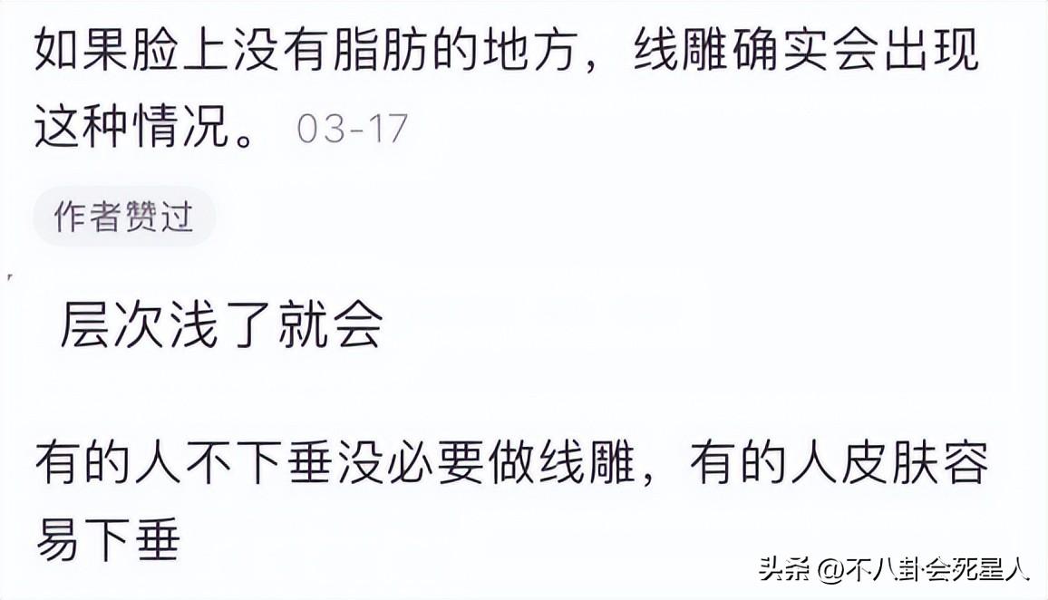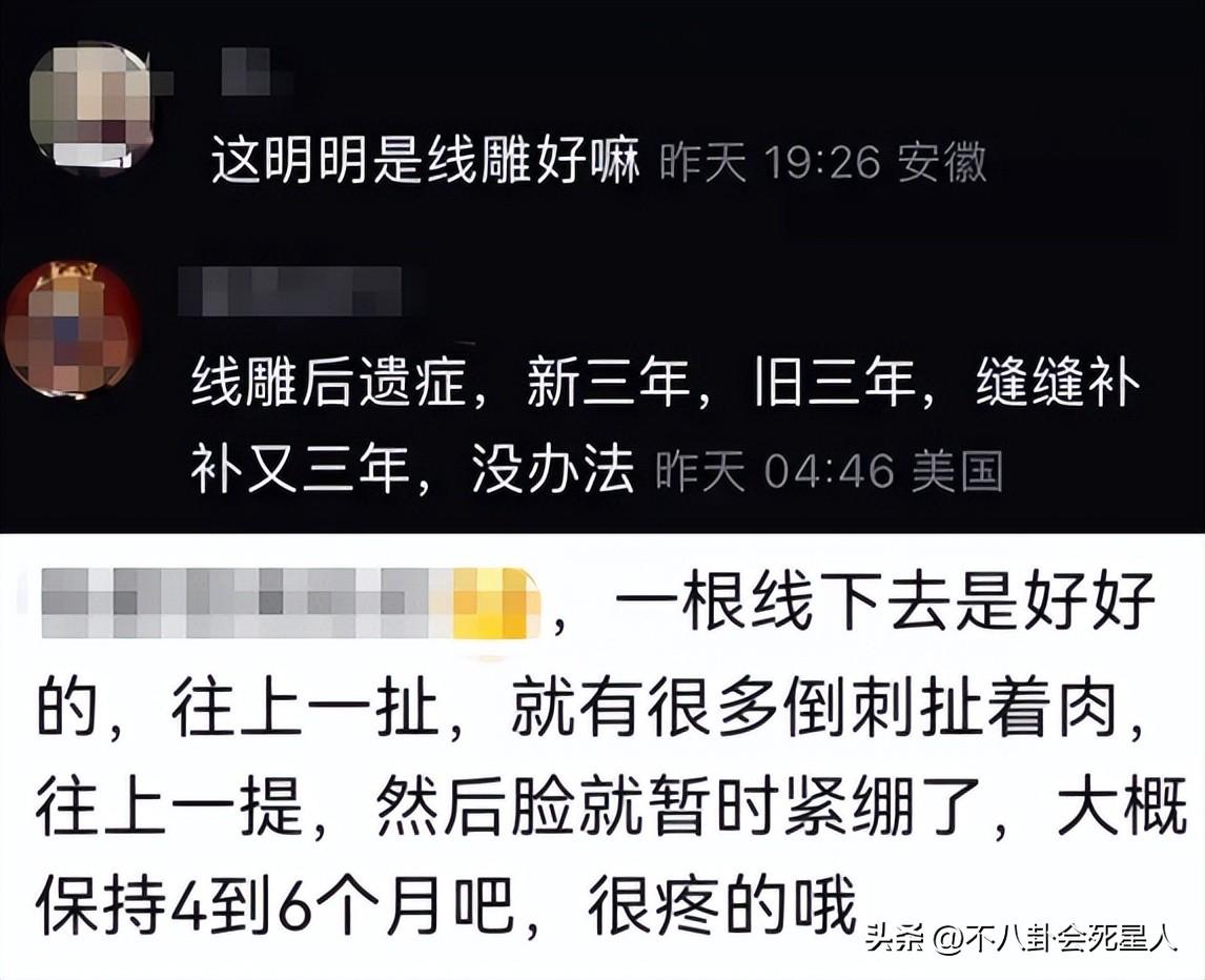 不懂的人在疑惑是不是光线问题,而懂行的网友一眼看出:这好像是做了脸部线雕的痕迹。所谓“线雕”就是为了紧致面部皮肤,在脸上做倒刺,做一次大概只能保持几个月左右,失效后又要去“缝缝补补”。