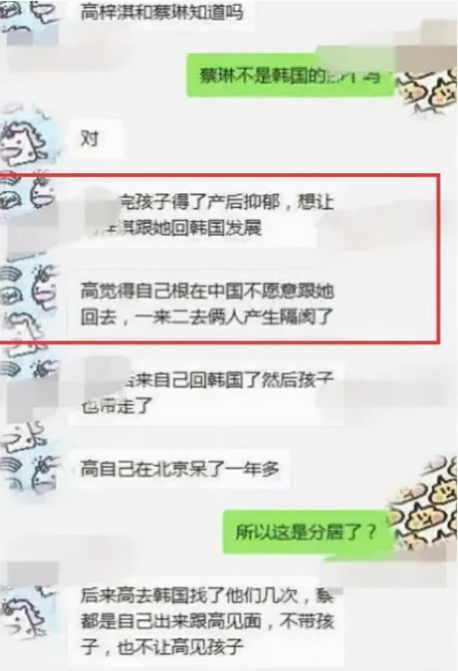 爆料说,离婚原因是蔡琳产后抑郁希望高梓淇和她一起带着孩子在韩国生活,高梓淇不同意。