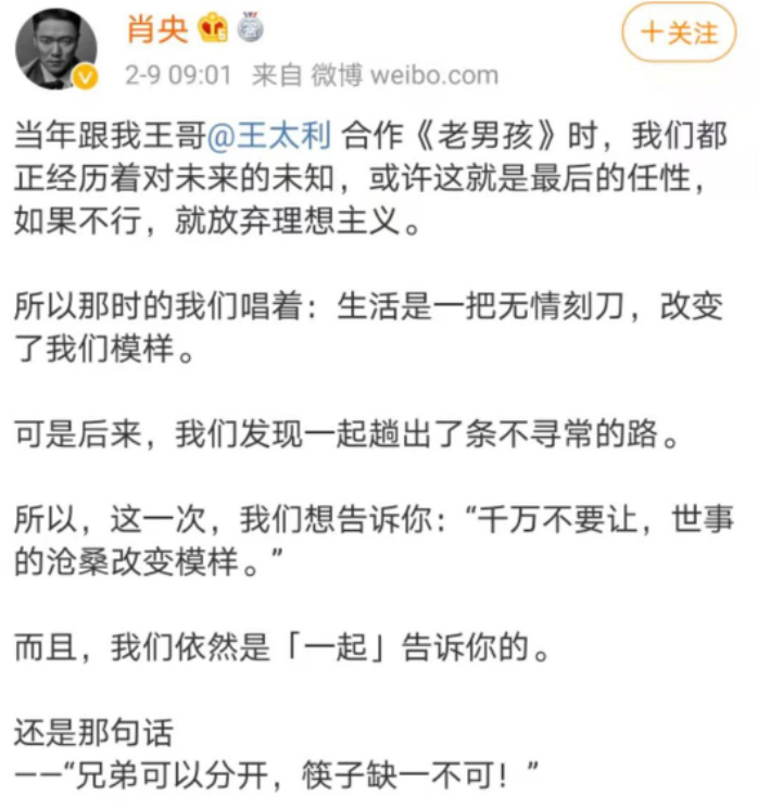 就像肖央说的,“兄弟可以分开,筷子缺一不可!”