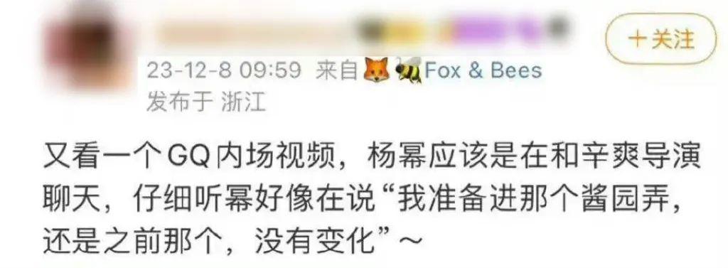 8 号该大粉观看杨幂出席典礼的视频,判断她与辛爽导演聊天,并且说着 " 我准备进那个酱园弄 "。