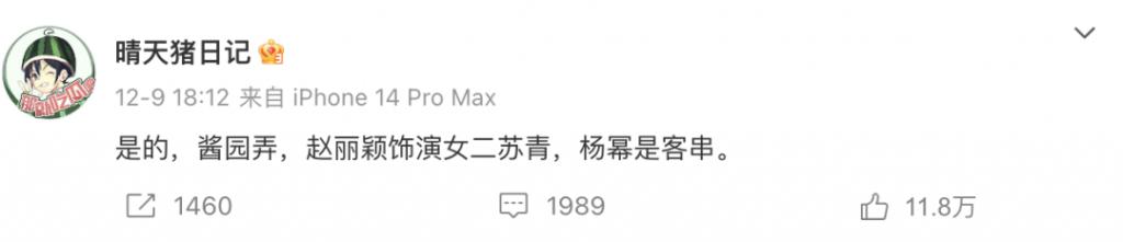 12 月 9 号有瓜主声称《酱园弄》的女二为赵丽颖,杨幂只是客串。