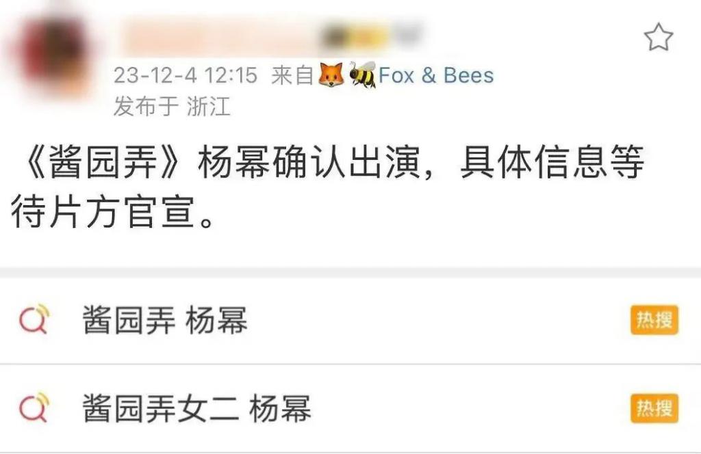 12 月 4 号,杨幂大粉称杨幂确认出演《酱园弄》,随后 " 杨幂 女二 " 登上热搜。