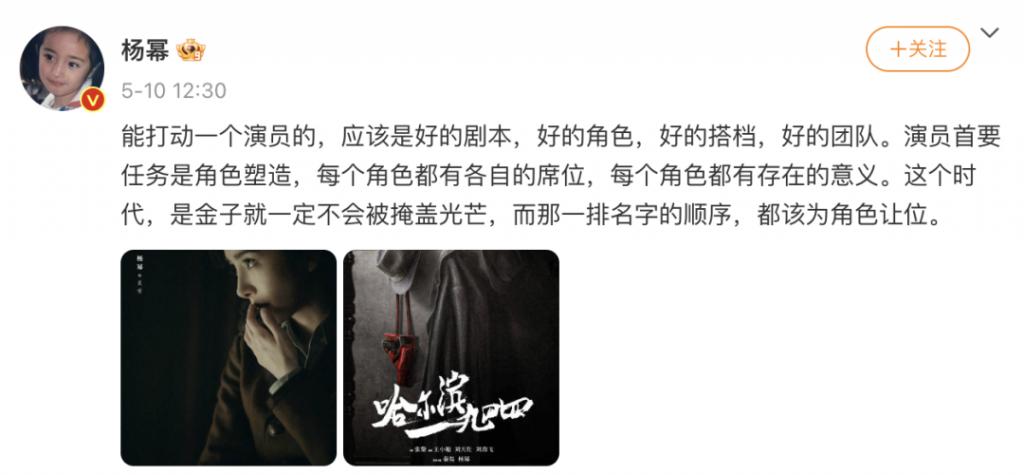 今年 5 月官宣离开嘉行后的第三天,杨幂就发微博称角色大于一切,番位该为角色让位;