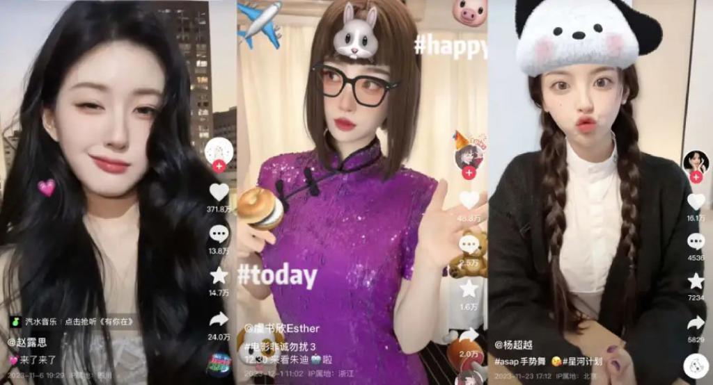 从左至右依次为赵露思、虞书欣、杨超越的抖音
