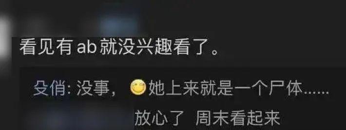2020 年出演《摩天大楼》时有路人表示 " 看见 AB 就没兴趣了 ",编剧直接回复 " 没事,她上来就是一个尸体 "。