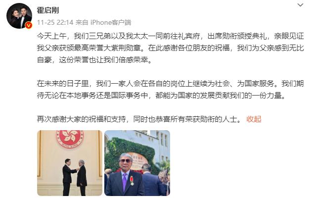 前几天,霍家三兄弟以及郭晶晶还出席了父亲霍震霆的授奖仪式。