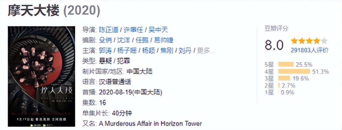 《摩天大楼》是在2020年暑假档播出的一部悬疑剧 ,由摩天大楼里发生的一桩凶杀案,引出了更多不可告人的秘密为剧情,成为当年暑假档的爆款电视剧,至今在豆瓣上评分为8.0。