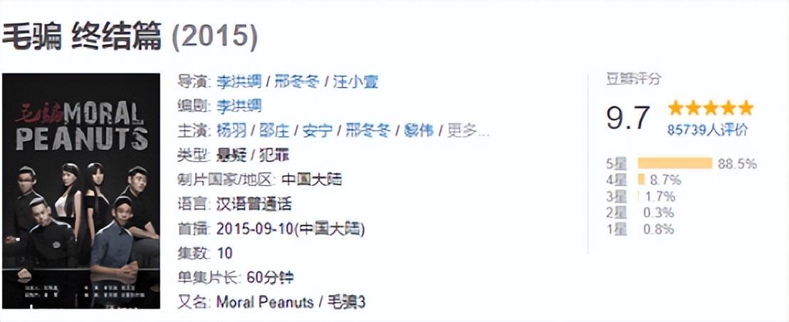 《毛骗·终结篇》在2015年播出,讲述的是一群盗亦有道的人混迹城市边缘的行骗故事,至今豆瓣评分为9.7。